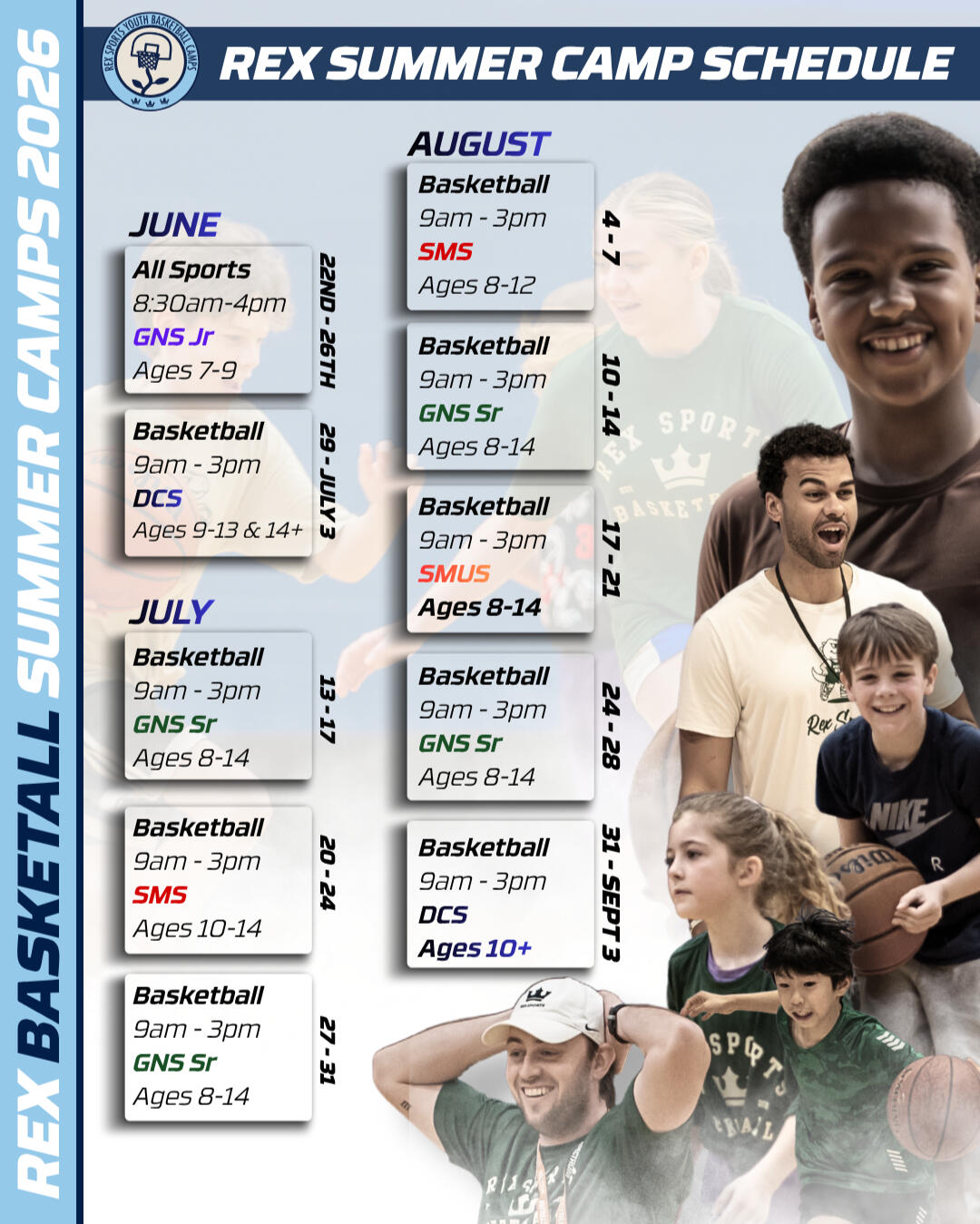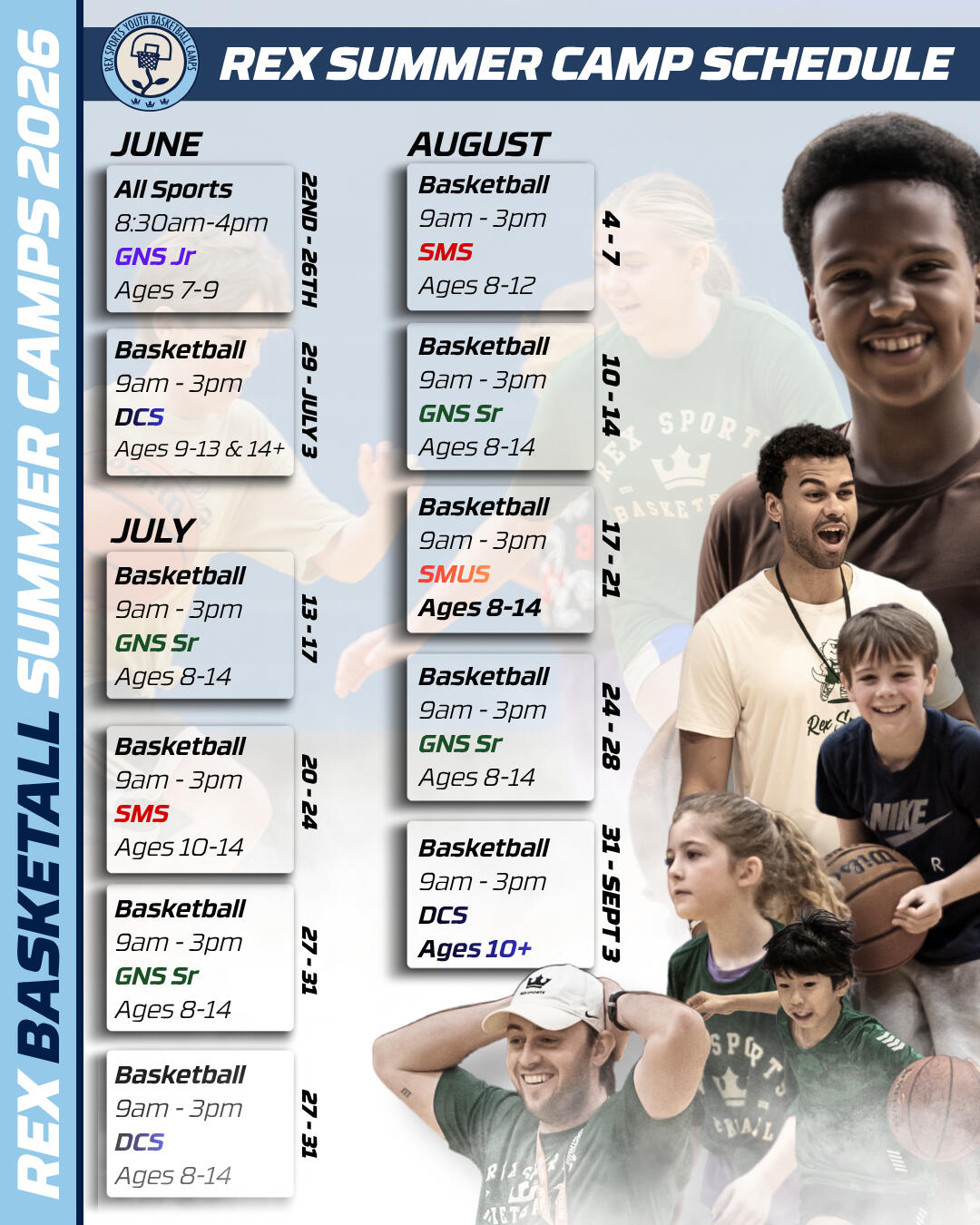 Jordan brings his professional experience to the court in a way that is approachable, encouraging, and centered on youth development. He works hard to connect with every camper, not just as a coach, but as a mentor who believes that a love for the game is the best motivator. At a Rex Sports camp, the day is filled with high-energy games, team-building activities, and plenty of opportunities to win prizes and awards. We create a space where it's safe to try new things, make mistakes, and celebrate every small victory along the way.The Rex Sports Community